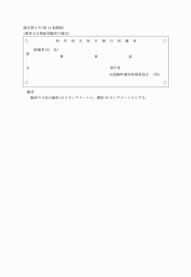 第6条 法第141条((自動車、船舶及び拡声機の表示))第6項の規定により、主として選挙運動のために使用する自動車又は、船舶及び拡声機の表示は、委員会が交付する様式第1号の2の表示板を掲示しなければならない。