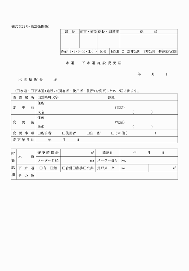 第22条 条例第20条第2項第3号に規定する営業を営む者の汚水排除量の申告は、様式第18号による申告書によってしなければならない。