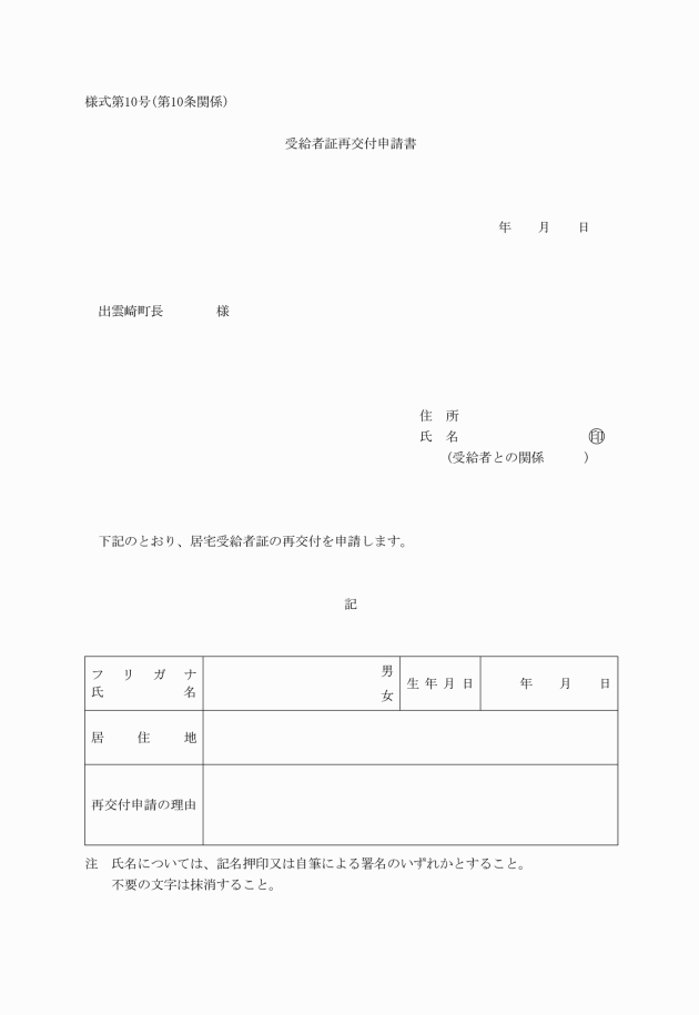 第10条 施行規則第21条の6第1項に規定する受給者証の再交付の申請は、様式第10号の受給者証再交付申請書によるものとする。