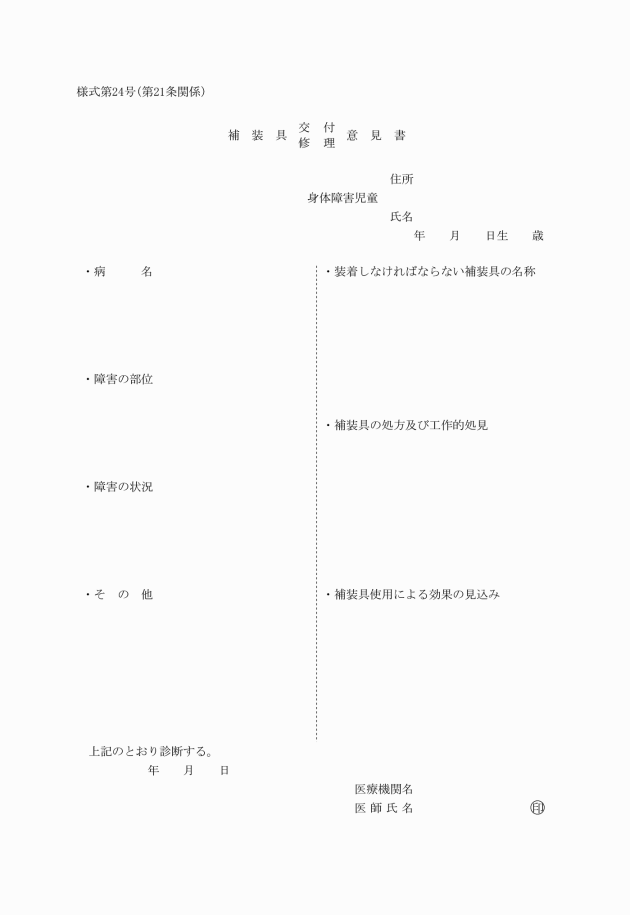 2 申請する補装具が、医学的判定を要するものである場合は、その交付及び修理の要否及び処方についての基礎資料とするため、医師の作成する様式第24号による補装具交付・修理意見書を添付しなければならない。