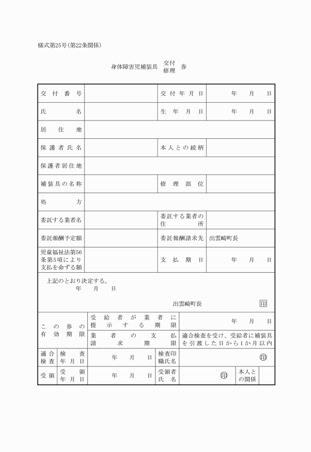 第22条 町長は、補装具の交付又は修理の決定をしたときは、速やかに様式第25号による身体障害児補装具交付・修理券を申請者に交付するものとする。