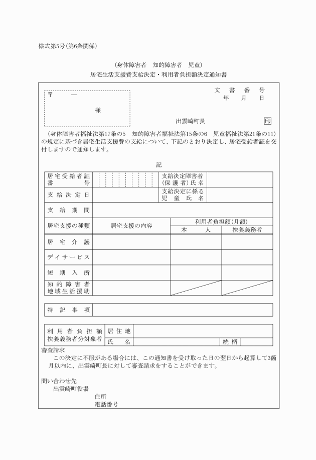 第7条 町長は、居宅生活支援費を支給しないことを決定したときは、様式第7号による不支給決定通知書を申請者に送付しなければならない。