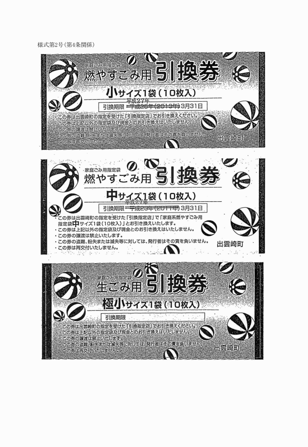 3 指定袋引換券の交付を受けた世帯は、町長が別に定める指定ごみ袋販売店において、当該指定袋引換券を家庭ごみ用指定袋と引き換えるものとする。