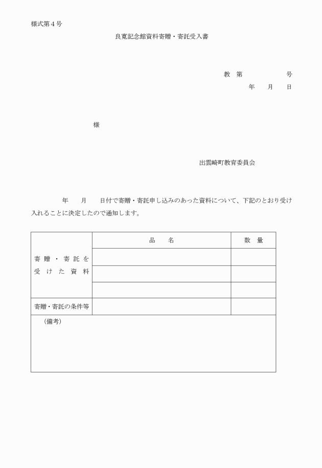 4 資料の寄贈又は寄託を受けたときは、良寛記念館資料寄贈・寄託受入書(様式第4号)を交付する。