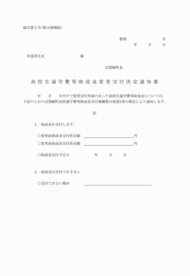 第9条 町長は、助成金の交付申請があったときは、交付の可否を決定し、その結果を高校生通学費等助成金交付決定通知書(様式第3号)により申請者に通知するものとする。