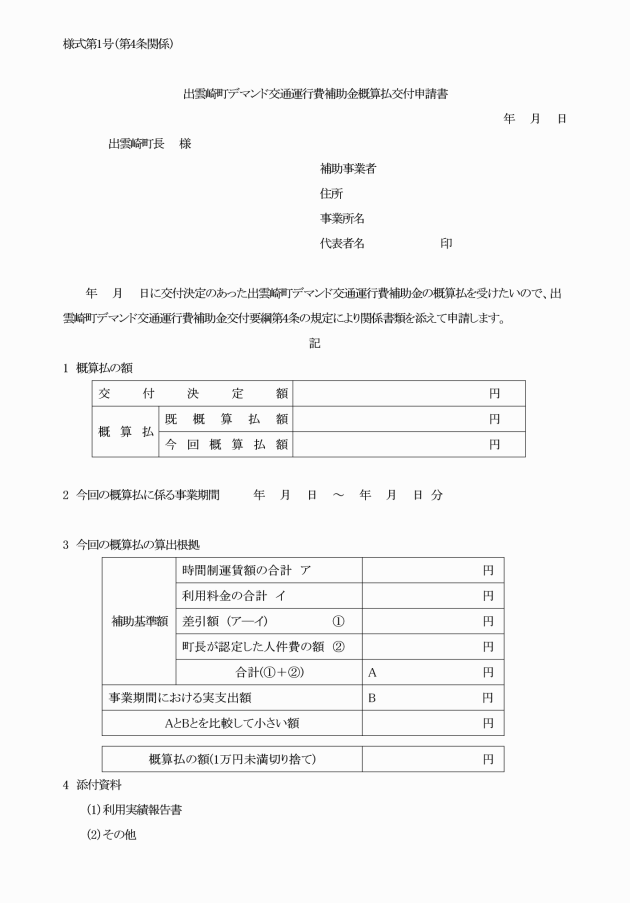2 補助事業者は、概算払を受けようとするときは、出雲崎町デマンド交通運行費補助金概算払交付申請書(様式第1号)により町長に申請しなければならない。