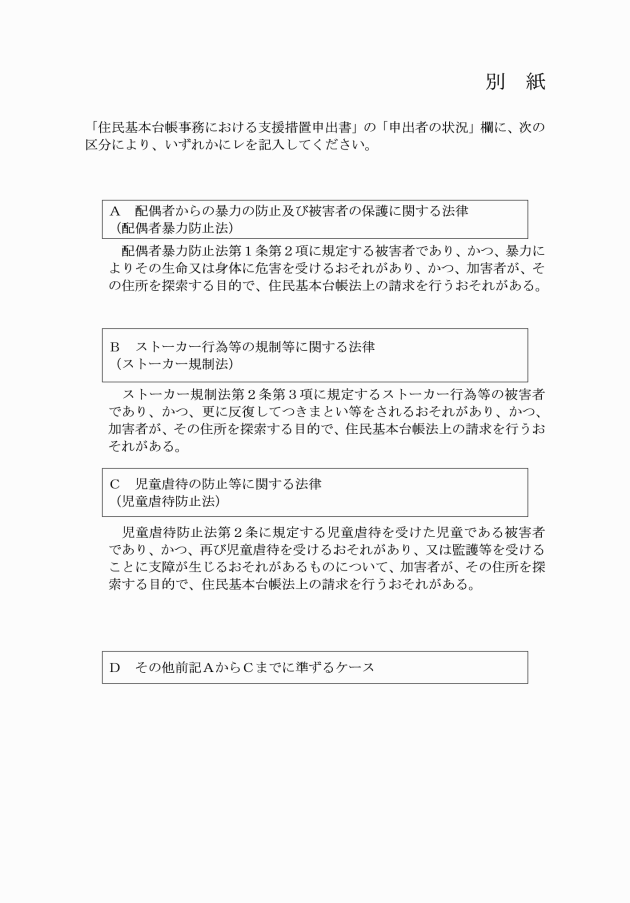 第2条 支援を受けることができる者(以下「支援対象者」という。)は、次の各号のいずれにも該当する者のうち、住民基本台帳事務に係る支援を希望するもの(その者が自己と同一の住所を有し、かつ、住民基本台帳事務に係る支援を希望する者を含む。)とする。